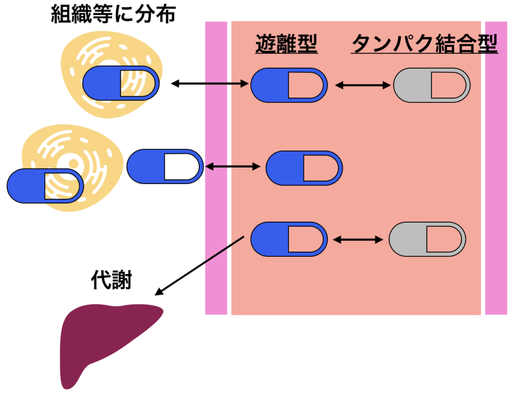 蛋白質に結合した薬物は、血液から移動することができないため、薬効・毒性がなく、代謝を受けることもありません。よって血液中に保存されているといってもよいかもしれません。逆に、実際に効果や副作用、代謝を受けるのは遊離型の薬剤です。