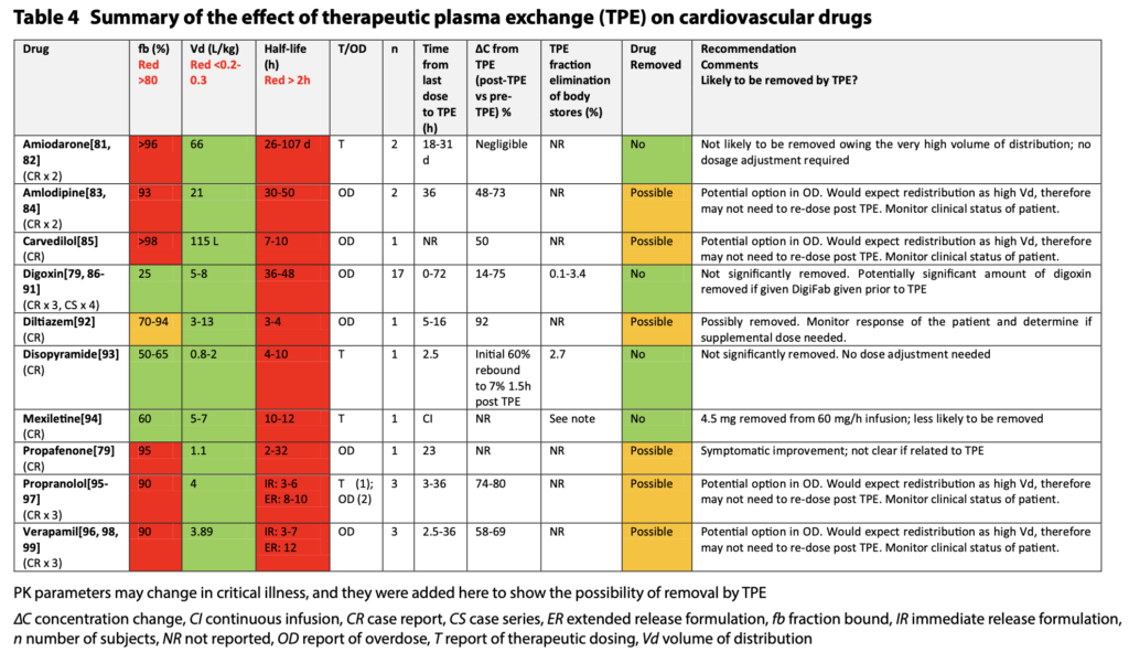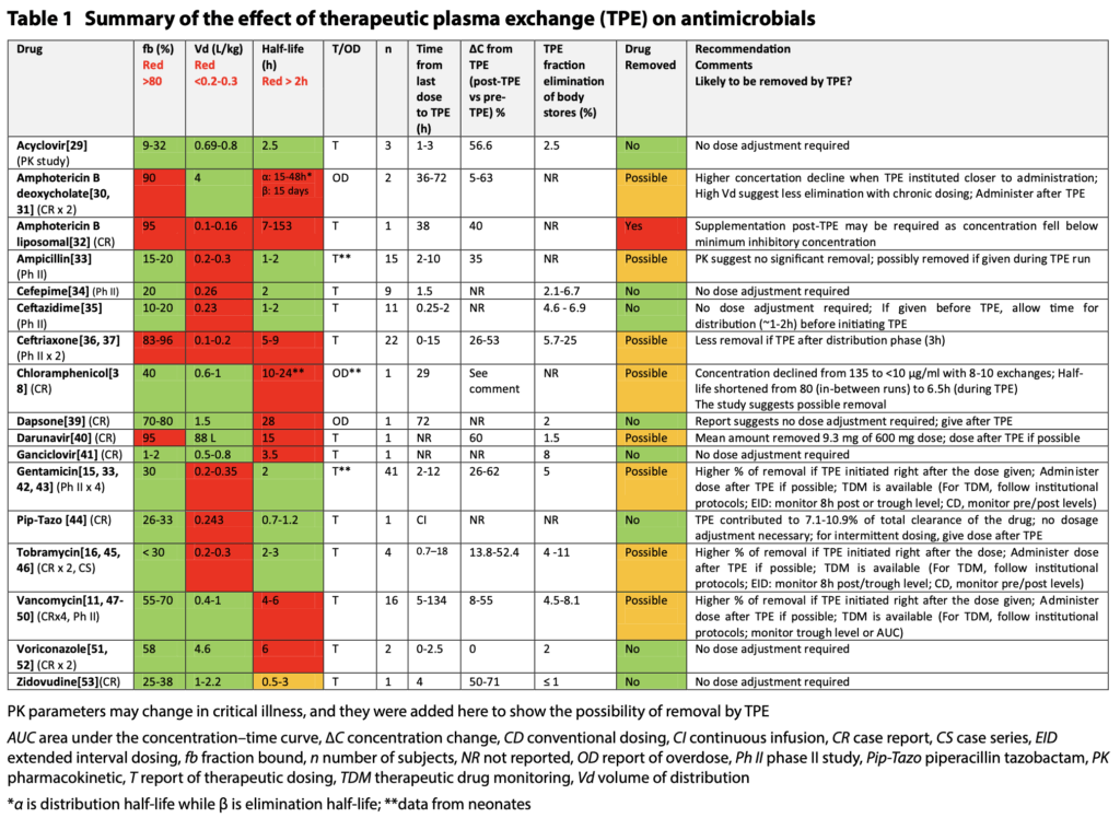 血漿交換による薬剤の除去率をまとめた論文を紹介します。