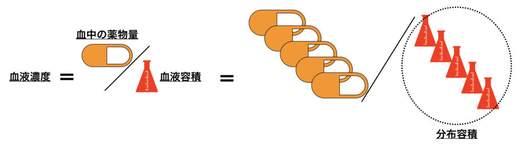 このとき、薬物の血中濃度は、分布した薬剤を血液容積で割って計算されます。従って、もともと投与する薬剤料を同じ濃度に希釈する血液容積は、血液中に分布する薬物量の逆数になるはずです。