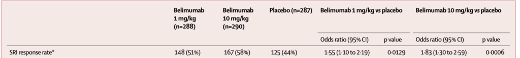 • Belimumab 1 mg/kg 21%、10 mg/kg 19%、プラセボ 12%(1 mg/kgでp=0.0252)