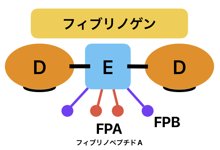 赤と紫の線(Aα鎖・Bβ鎖)の先端に、FPA・FPB(フィブリノペプチド)が結合している構造をしています。
