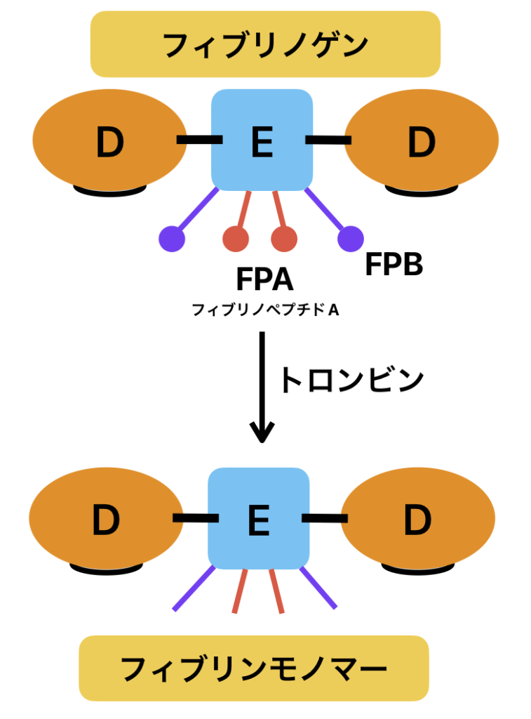 トロンビン(凝固因子Ⅱ)によって、FPA・FPBが切り離されると、フィブリンモノマーになります。