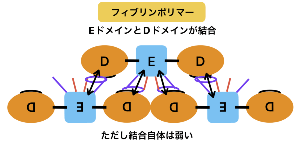 これによって、赤と紫の線が、Dの下の穴に入り込むことができるようになります。これによって重合体=ポリマーを形成します。これをフィブリンポリマーといいます。