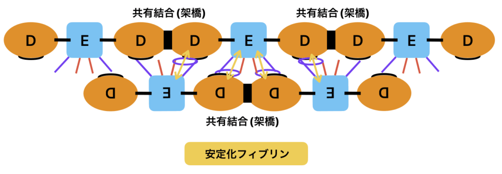 これだと結合は弱く、しっかりした構造ではありません。そこで、隣り合うD同士を共有結合で接着することで、強固な安定化フィブリンを形成することができます。