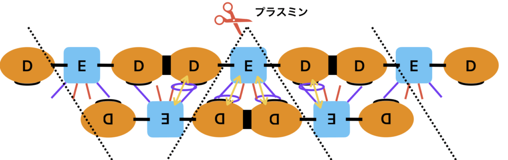 線溶系は、弱い部分をプラスミンによって切断していく過程をいいます。この場合、E-Dの間が主に切断されます。