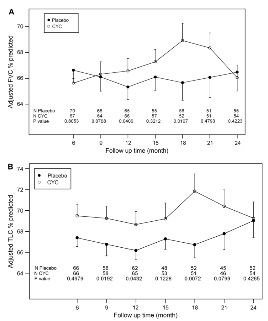 - 12ヶ月:CYC群で4.62%高いFVC(P = 0.007)