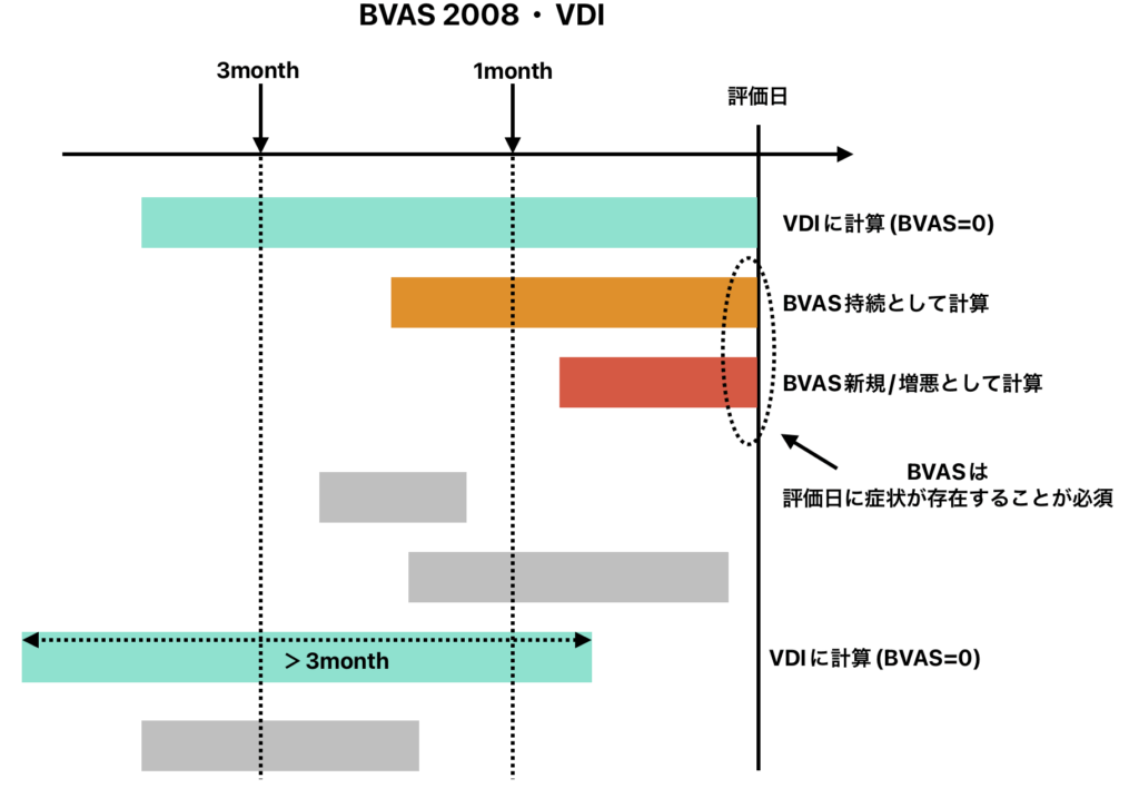 - BVASでは評価時に症状が存在することが必須でしたが、VDIは3ヶ月以上どこかのタイミングで持続していれば加点されます